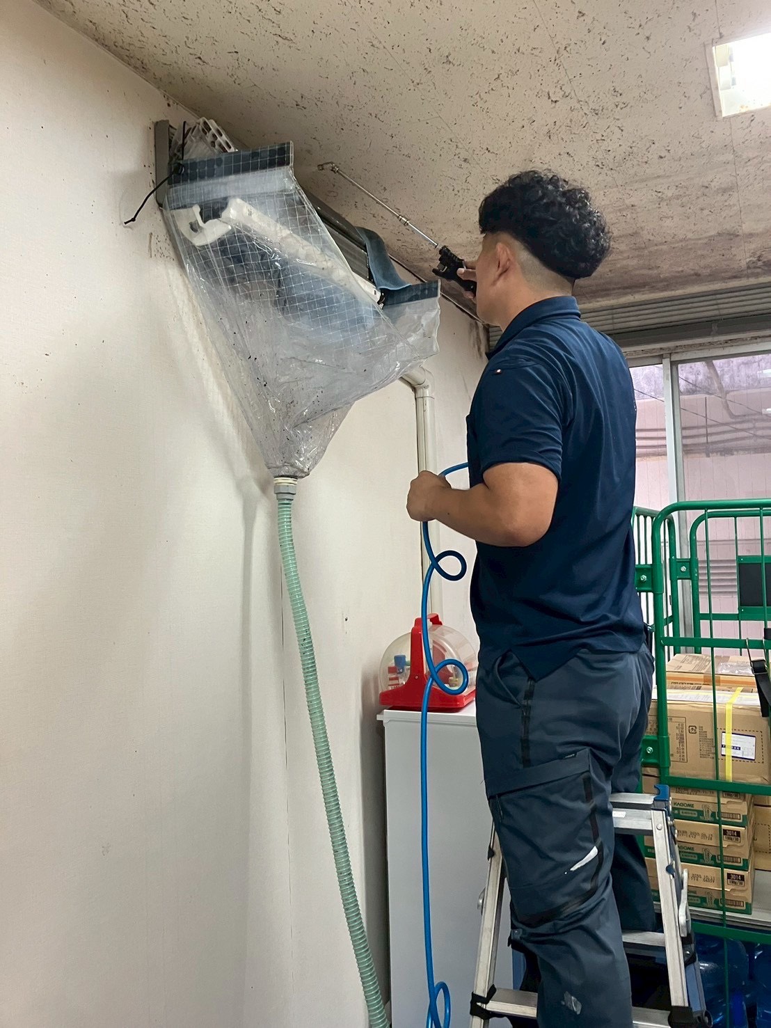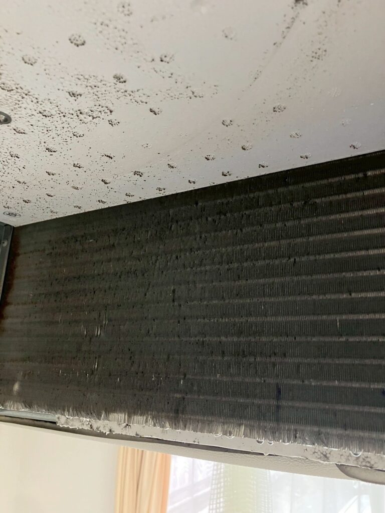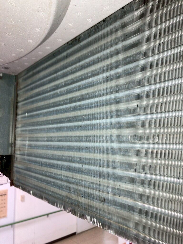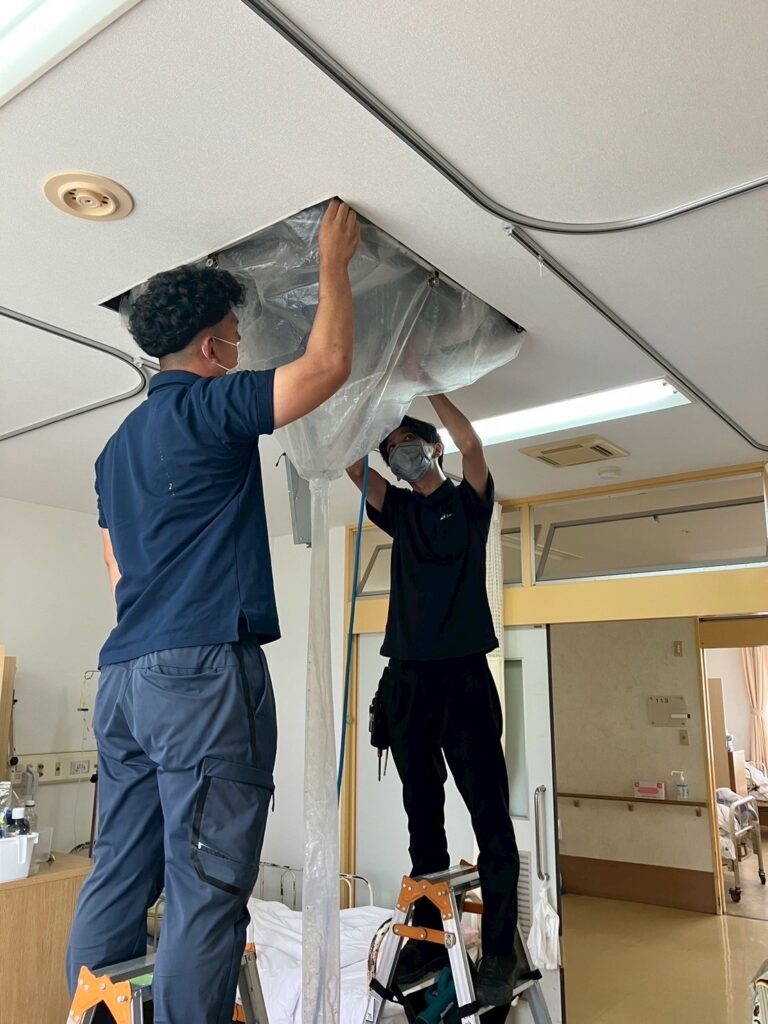 先日、医療施設にて業務用エアコン(天井埋め込み型)と家庭用スタンダードエアコンの洗浄作業を行いました。