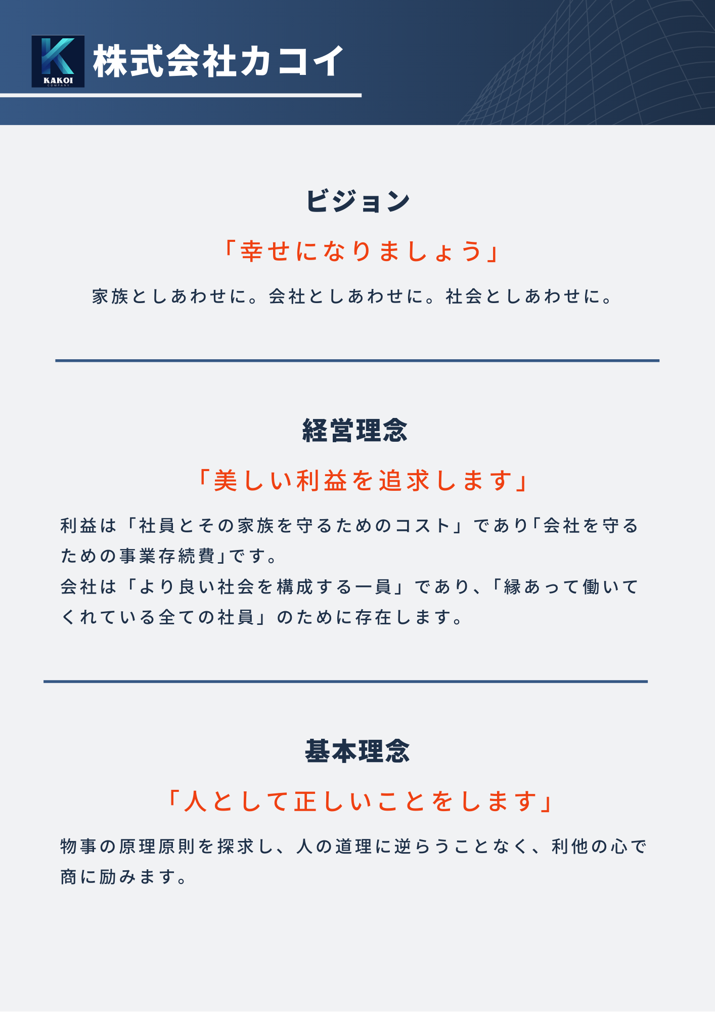 弊社は創業以来、「人として正しいことをします」という基本理念のもと、社会に貢献できる企業組織を創造することに尽力して参りました。
